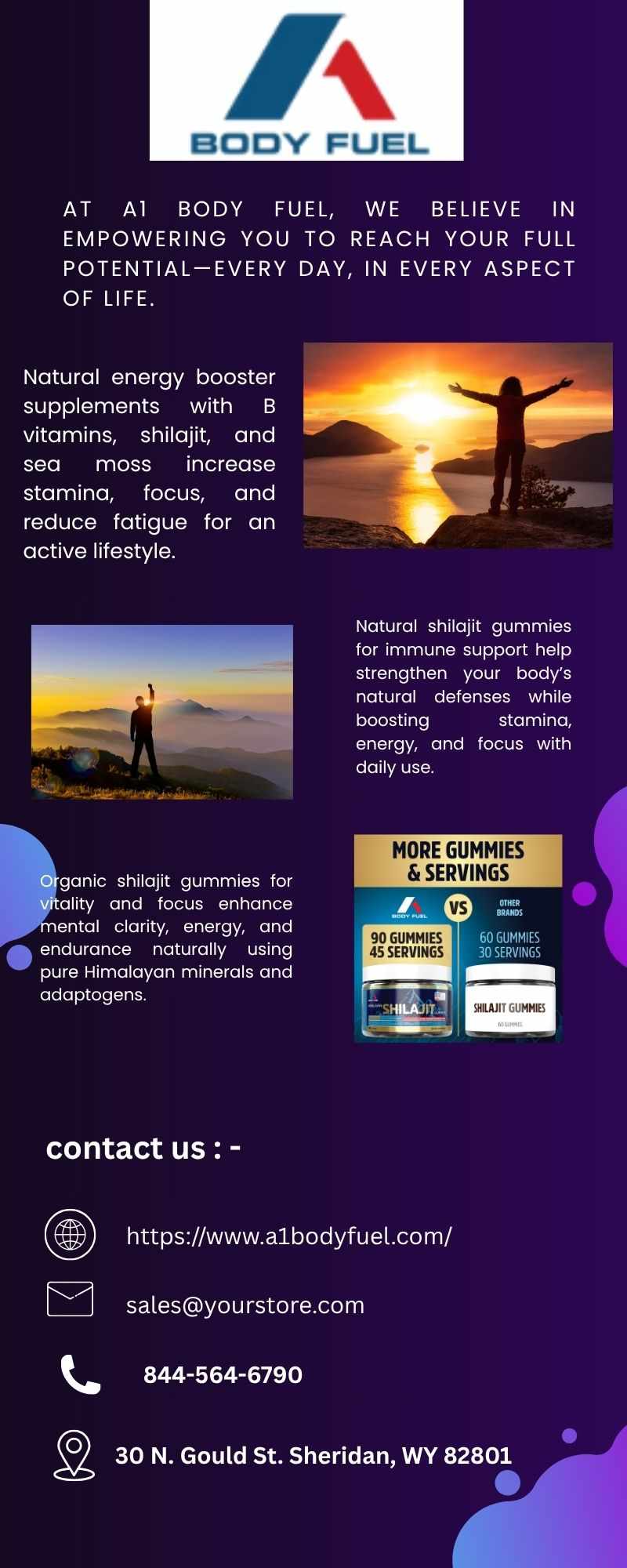 In today's fast-paced environment, fatiFuel'sd mental fog is all too typical. That's where A1 Body Fuel comes in. It gives you a natural boost to help you get through the day. Their finest shilajit gummies for energy and concentration mix old Ayurvedic knowledge with contemporary convenience. These candies taste great and are full of minerals and fulvic acid that may help you feel clearer and more energetic without the jitters that come with coffee. A1 Body Fuel is a simple and efficient solution to remain sharp all day long for those who want to keep their energy up.